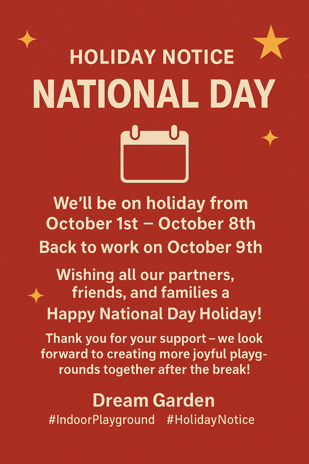 Please be informed that Dream Garden Amusement Equipment Co., Ltd. will be closed for the National Day Holiday from October 1st to October 8th, 2025. We will resume normal business operations on October 9th, 2025.