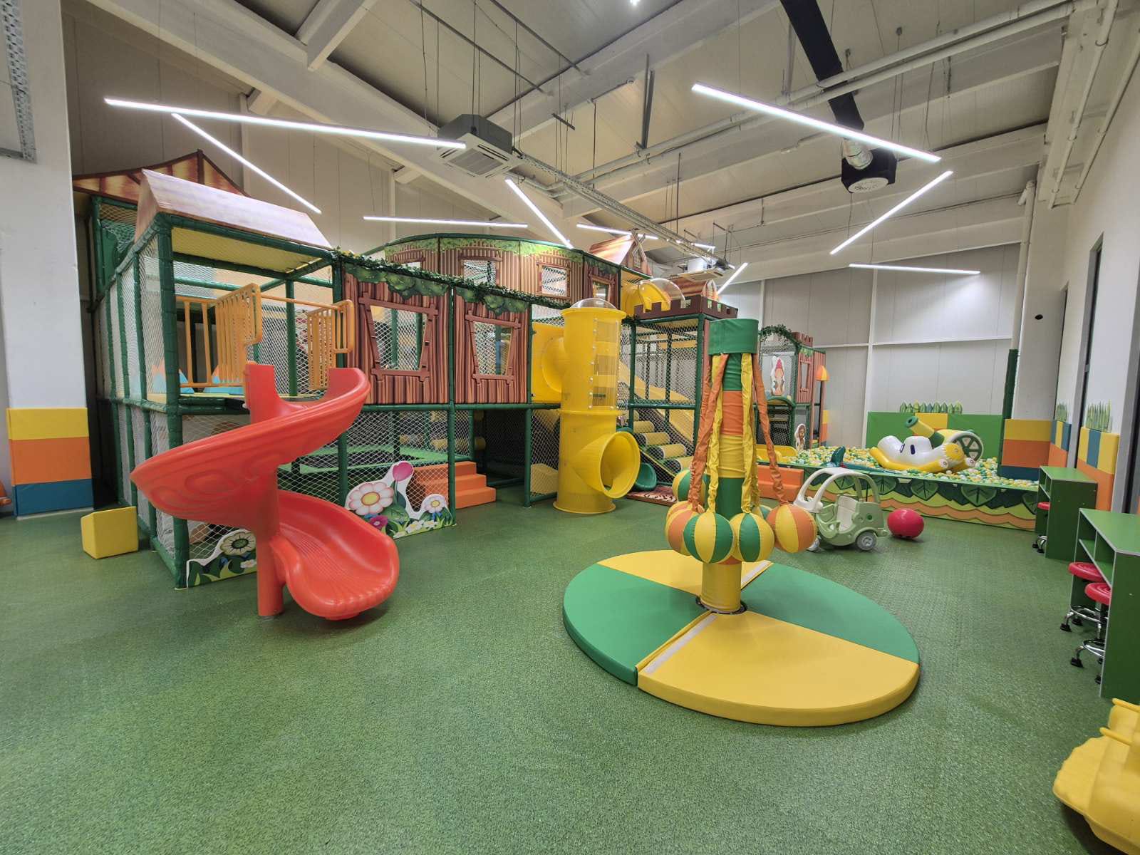 This indoor playground adopts a nature-inspired jungle theme, combining bright green, yellow, and wood-style elements to create a warm, playful environment suitable for children aged 2–10 years.