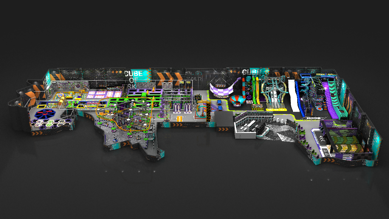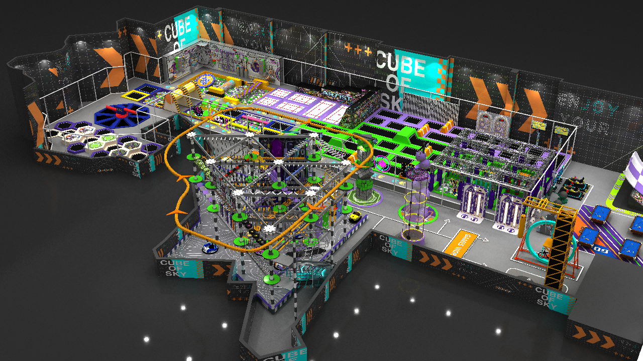 Dream Garden developed this large-scale family entertainment center design for a modern indoor adventure park project. The layout combines multiple attractions into one integrated commercial amusement venue, including trampoline zones, slide towers, ropes-based adventure structures, ninja challenge elements, interactive game areas, and social entertainment spaces.