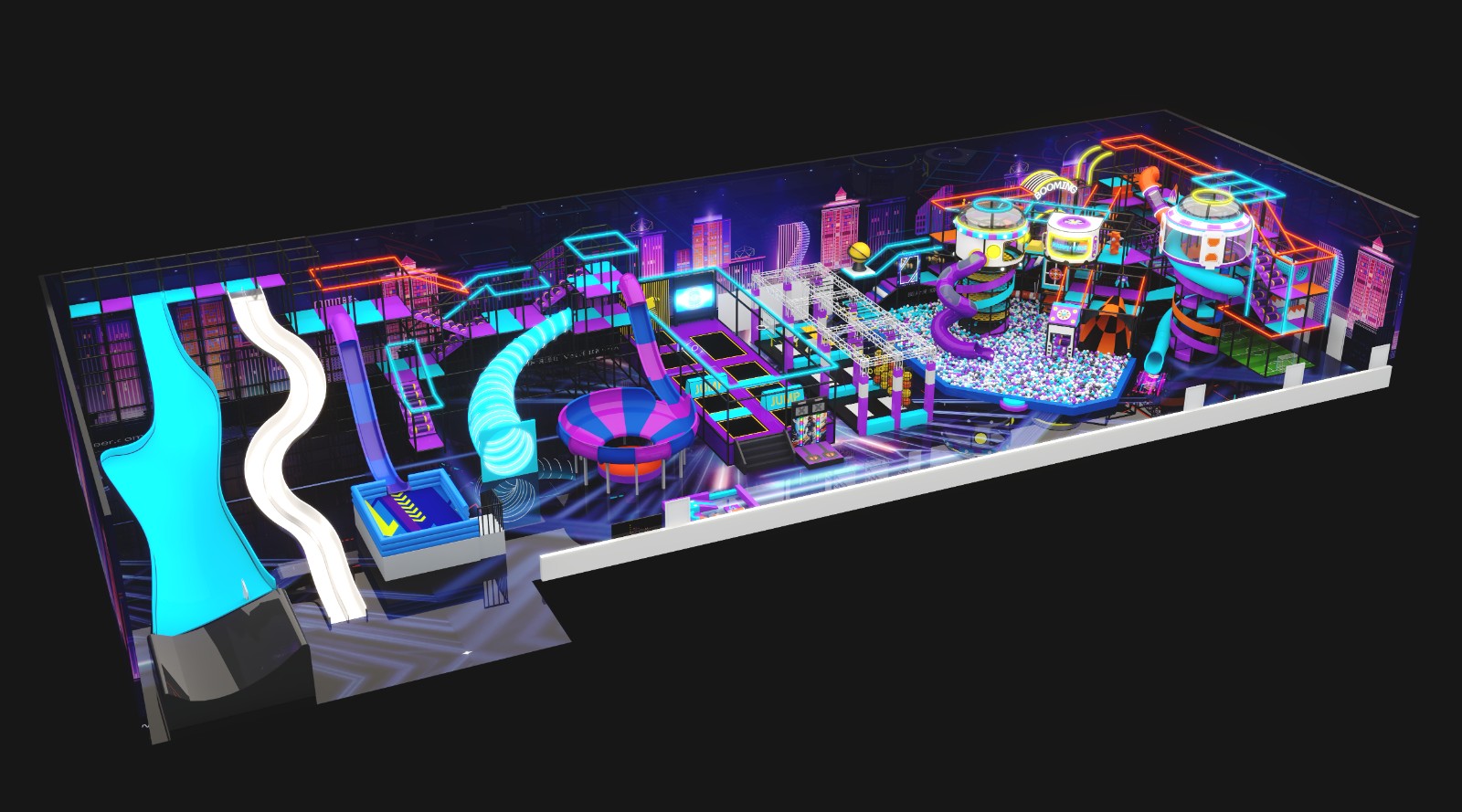 Neon City Adventure is a large-scale indoor playground designed for modern Family Entertainment Centers seeking higher engagement, longer dwell time, and broader age coverage. By integrating competitive slide attractions, elevated soft play structures, and immersive neon city theming, this project transforms a traditional kids’ playground into a high-return indoor entertainment destination.