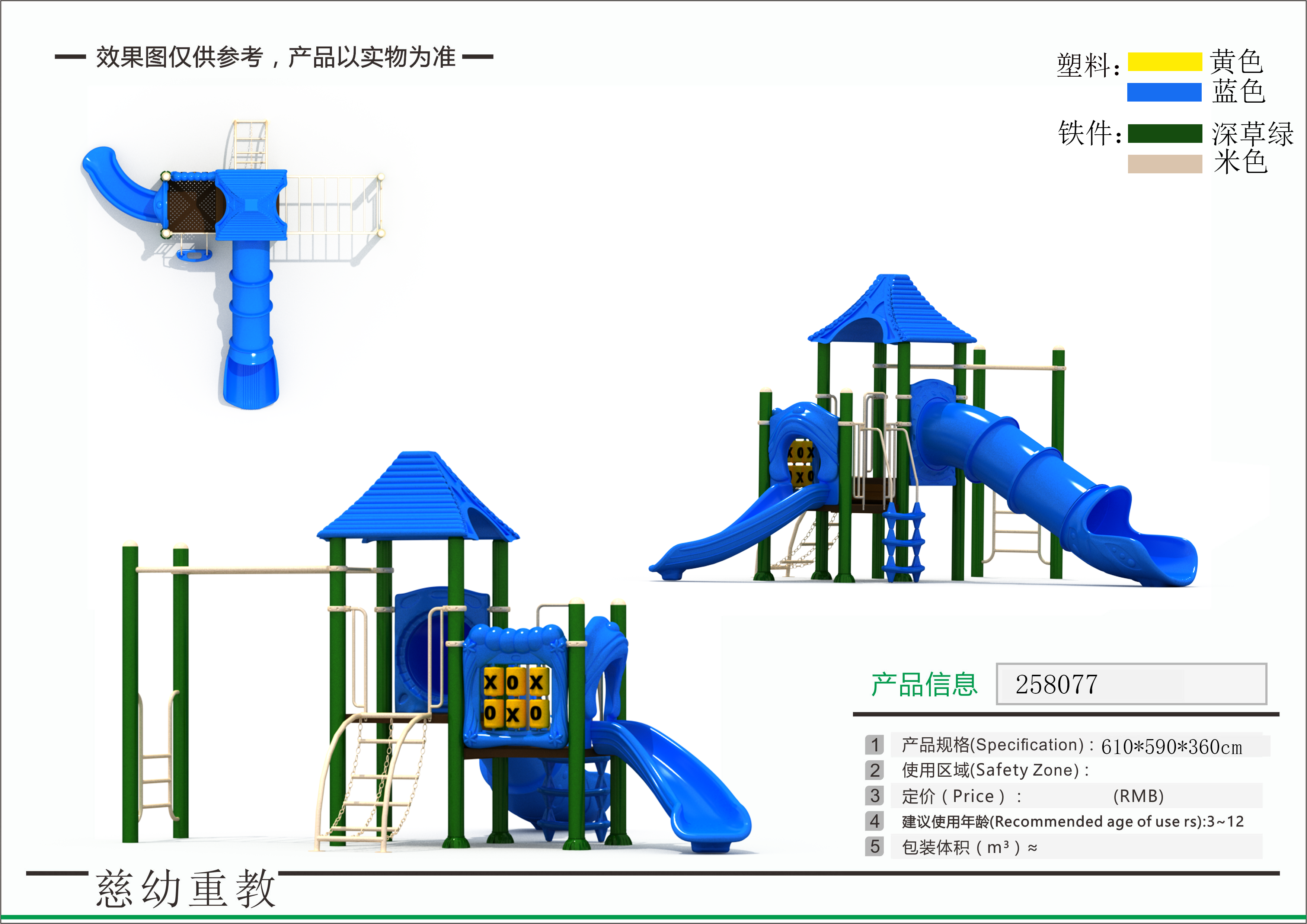 The Outdoor Playground Slide Set 258077 is a versatile and durable commercial play system designed for children aged 3 to 12. With its multi-level platforms, spiral tube slide, straight slide, interactive tic-tac-toe panel, and monkey bar fitness station, this structure provides a complete outdoor play experience that encourages physical activity, creativity, and social interaction.