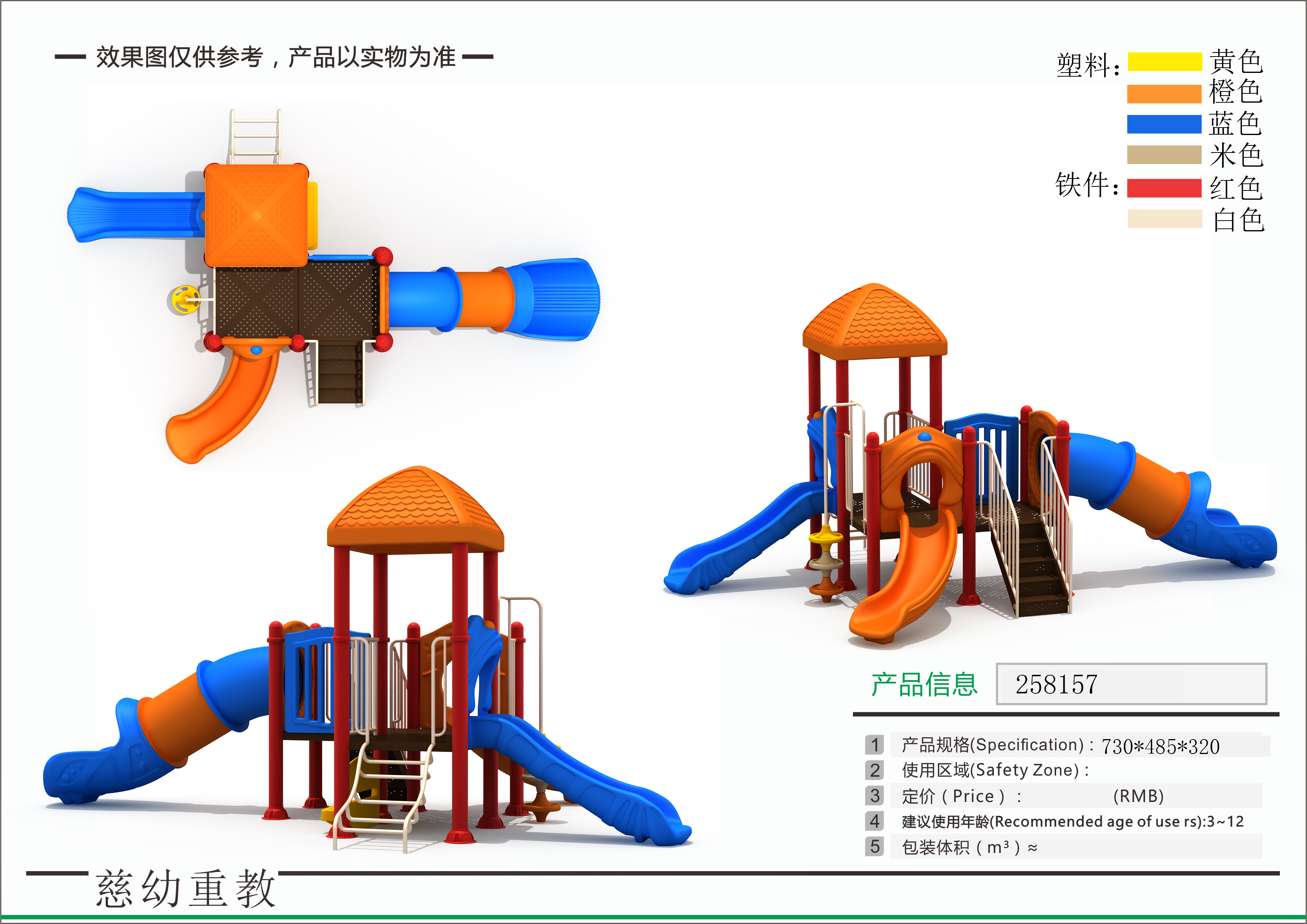The Outdoor Playground Slide Set 258157 is designed for long-term outdoor use in schools, parks, residential communities, and commercial play areas. Made from UV-resistant LLDPE plastic and heavy-duty galvanized steel, this playground structure provides a safe, exciting, and durable play experience for children aged 3 to 12.