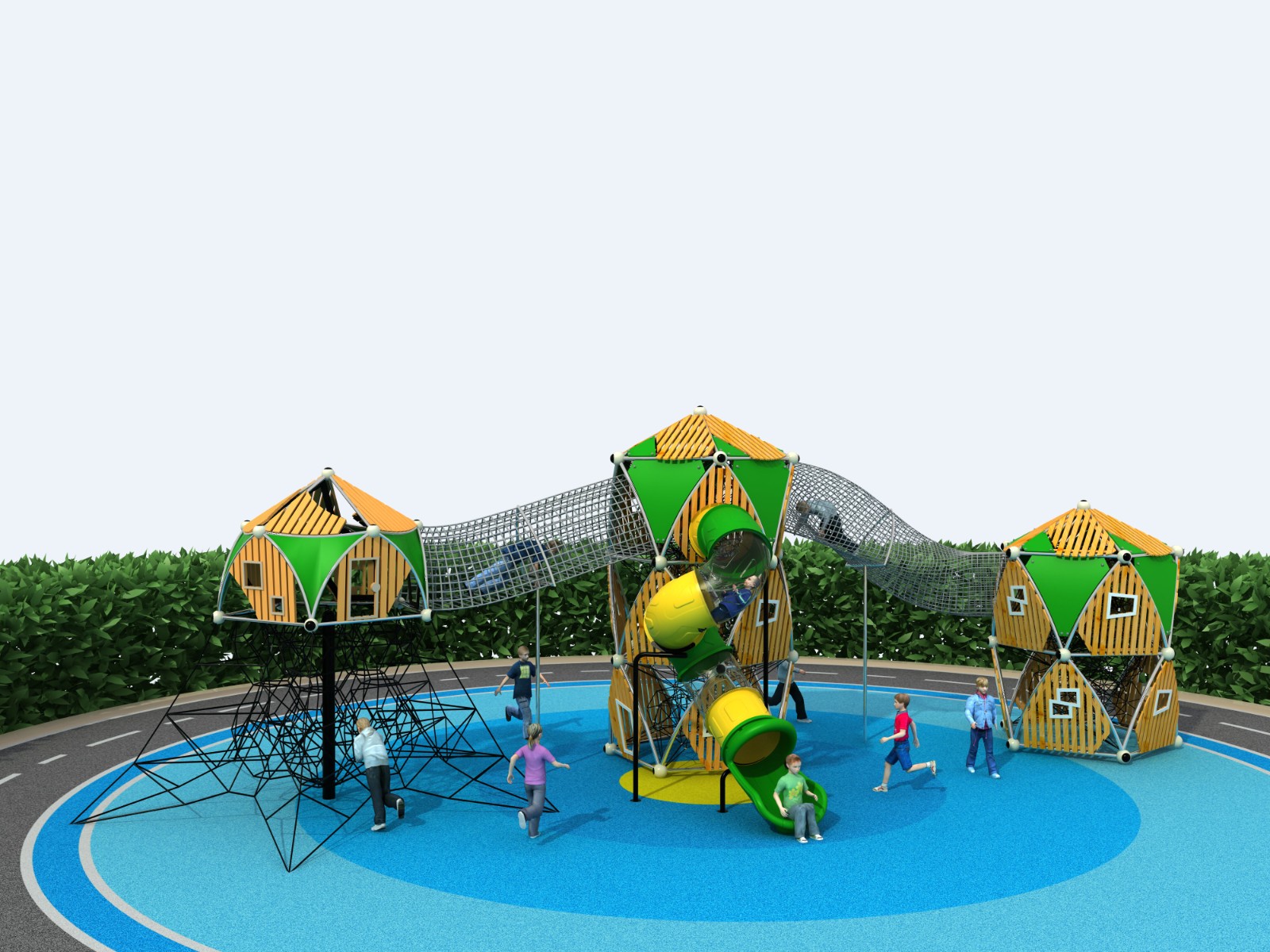 A premium outdoor adventure playground featuring interconnected treehouse towers, rope bridges, tunnel slides, and multi-direction climbing nets. Designed for children aged 4–14, this nature-inspired system encourages exploration, creativity, and active outdoor play. Ideal for parks, resorts, schools, and modern urban playground spaces.