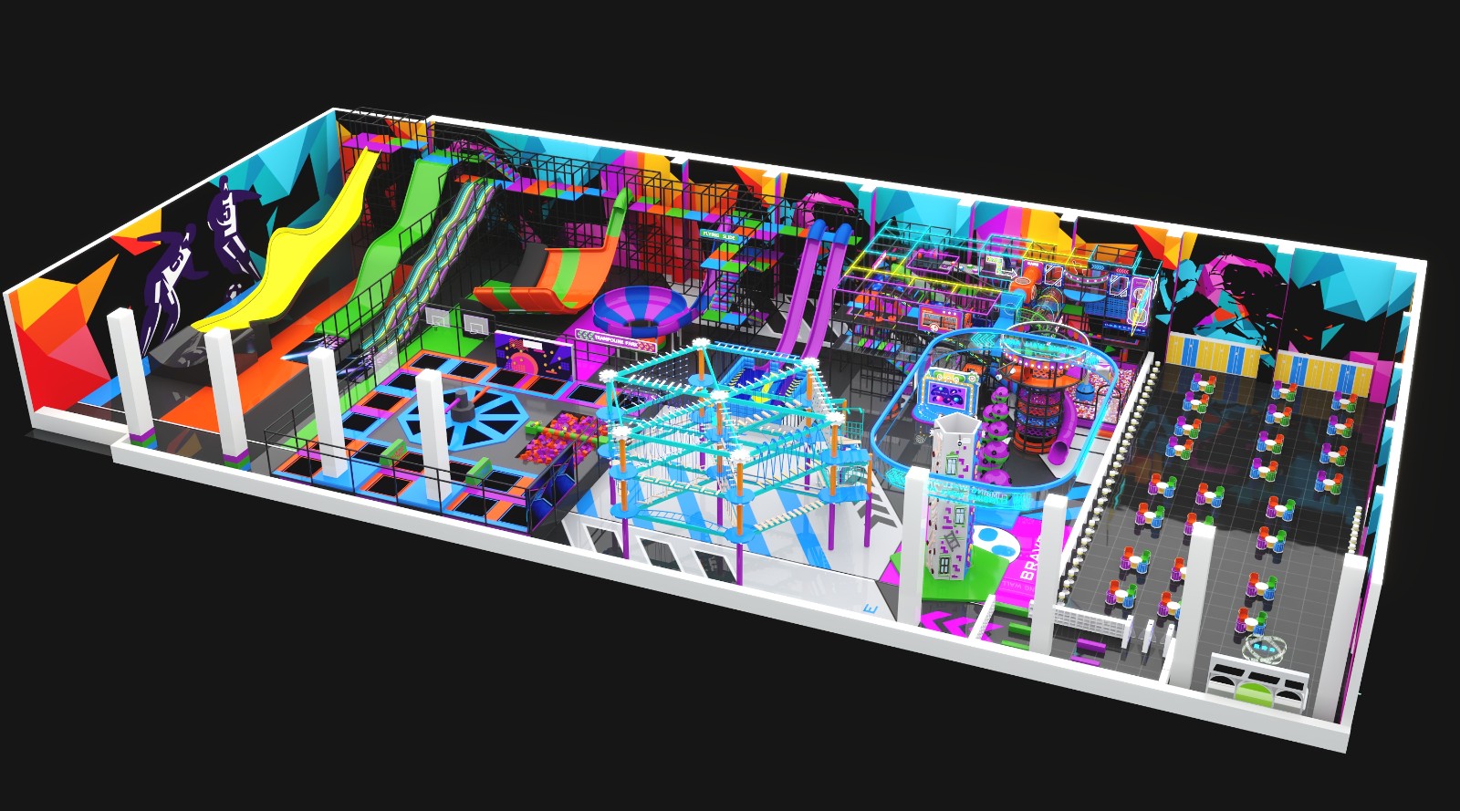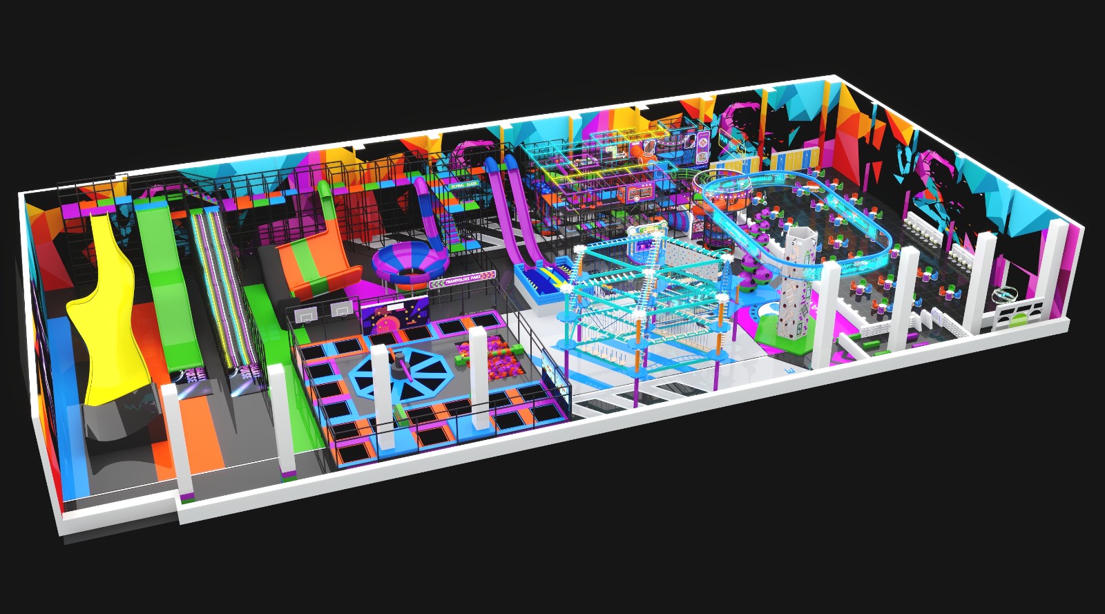 Urban Pulse Adventure is a next-generation indoor playground and trampoline park designed for modern Family Entertainment Centers seeking higher energy, broader age appeal, and stronger commercial performance. By integrating trampolines, competitive slide attractions, rope courses, and interactive play zones, this project delivers a complete indoor entertainment experience for children, teenagers, and adults.